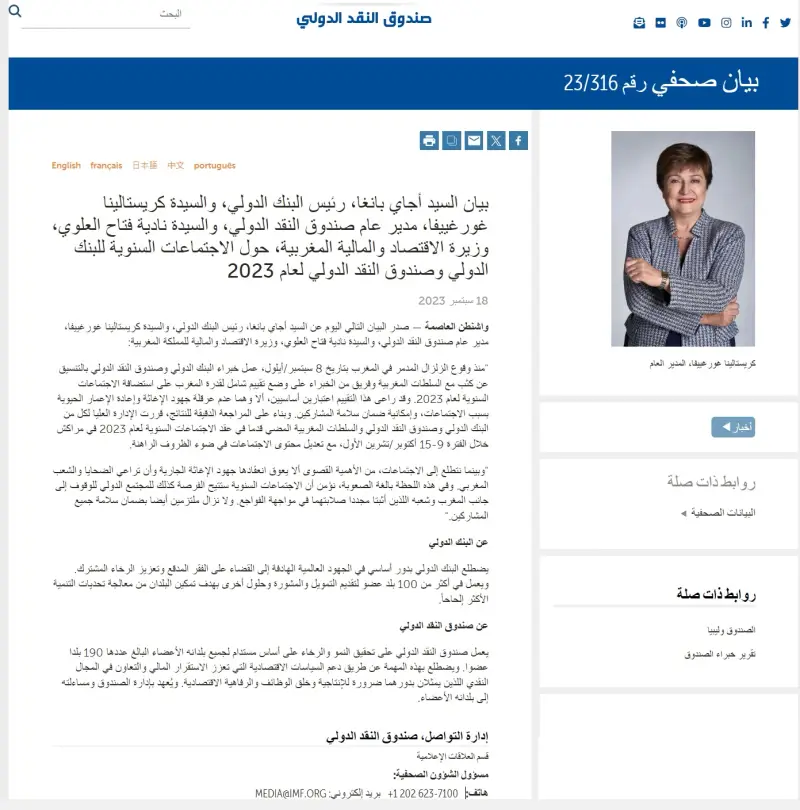 ووفقا لبيان نشر على موقع صندوق النقد، فقد قال رئيس البنك أجاي بانغا ومديرة صندوق النقد الدولي كريستالينا جورجيفا ووزيرة الاقتصاد المغربية نادية فتاح العلوي: