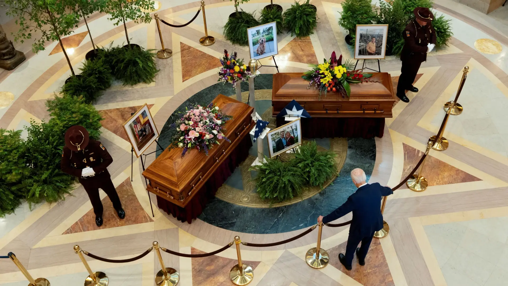 بايدن وصل في فترة الظهيرة، اقترب من النعوش الثلاثة، رسم إشارة الصليب، وقف دقيقة صمت، ثم ركع للحظة أمامها قبل أن يغادر لتحية الحاضرين.