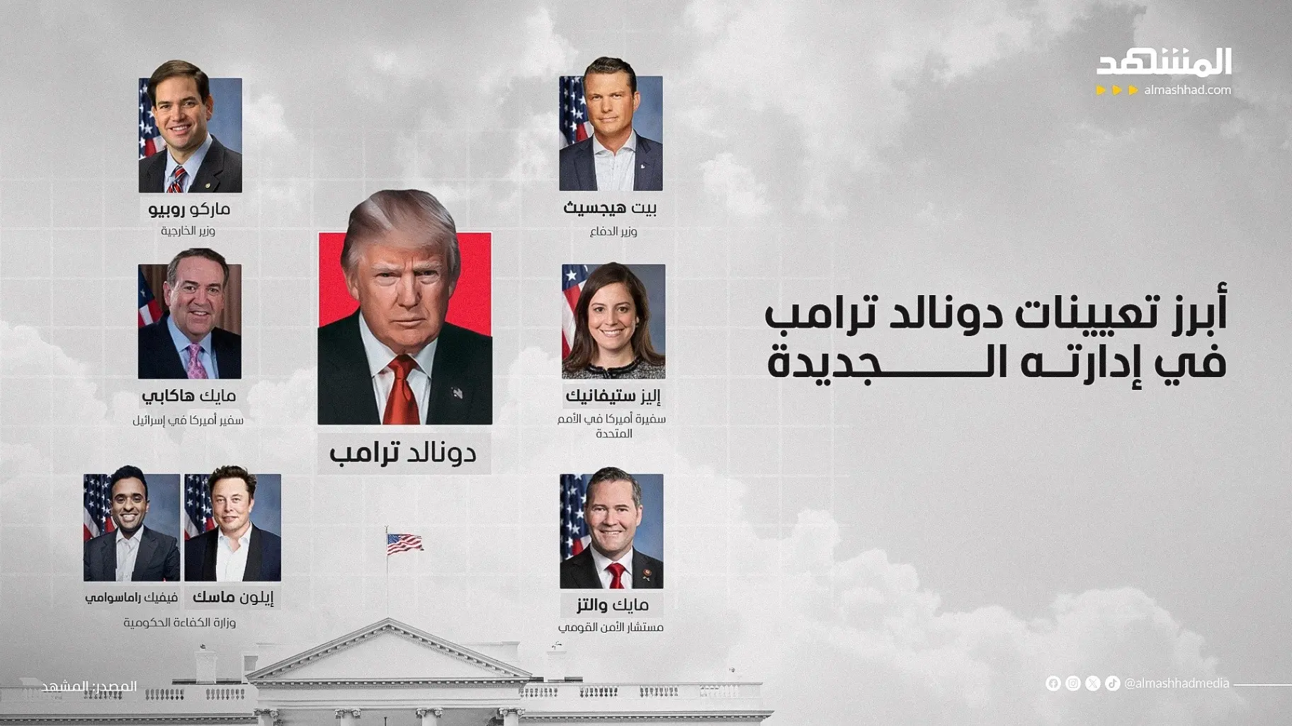 أعلن الرئيس الأميركي المنتخب دونالد ترامب بعض التعيينات المحتملة في إدارته القادمة، حيث عين وزيرًا للدفاع، وقيصرًا للحدود، ومستشارًا للأمن القومي، ومديرة للاستخبارات الوطنية، ووزيرًا للعدل، ووزيرًا للخارجية، وسفيرة للولايات المتحدة لدى الأمم المتحدة، إضافة لتسمية شخصيات سياسية أخرى، من المحتمل أن تلعب دورًا في عهدته الرئاسية الثانية، وعلى رأسها الملياردير إيلون ماسك رفقة فيفك رامسوامي المعينين لقيادة وكالة جديدة تحت اسم إدارة الكفاءات الحكومية مهمتها تقييم الإنفاق الفيدرالي و ترشيده.