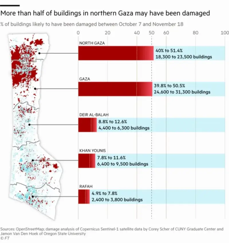 فقد تمكن الجيش الإسرائيلي بحوالي 45 يوما من تحويل نصف مباني شمال قطاع غزة إلى دمار كامل وإلحاق أضرار بالغة وجسيمة بأكثر من نصف مساحات كبيرة في أحياء بأكملها، وفقا لتقرير تحليلي لصحيفة "فايننشال تايمز".