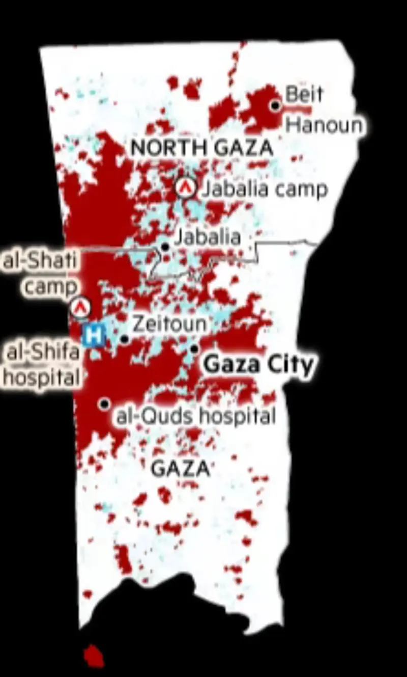 وتحوّل إسرائيل الآن تركيزها شرقا في مدينة غزة ثم إلى جنوب غزة. وخلال عطلة نهاية الأسبوع، أبلغ الفلسطينيون عن وقوع قصف عنيف في الزيتون ومخيم جباليا للاجئين، وقالت الأمم المتحدة إن انفجارات عدة وقعت في المدارس التي يحتمي بها المدنيون.