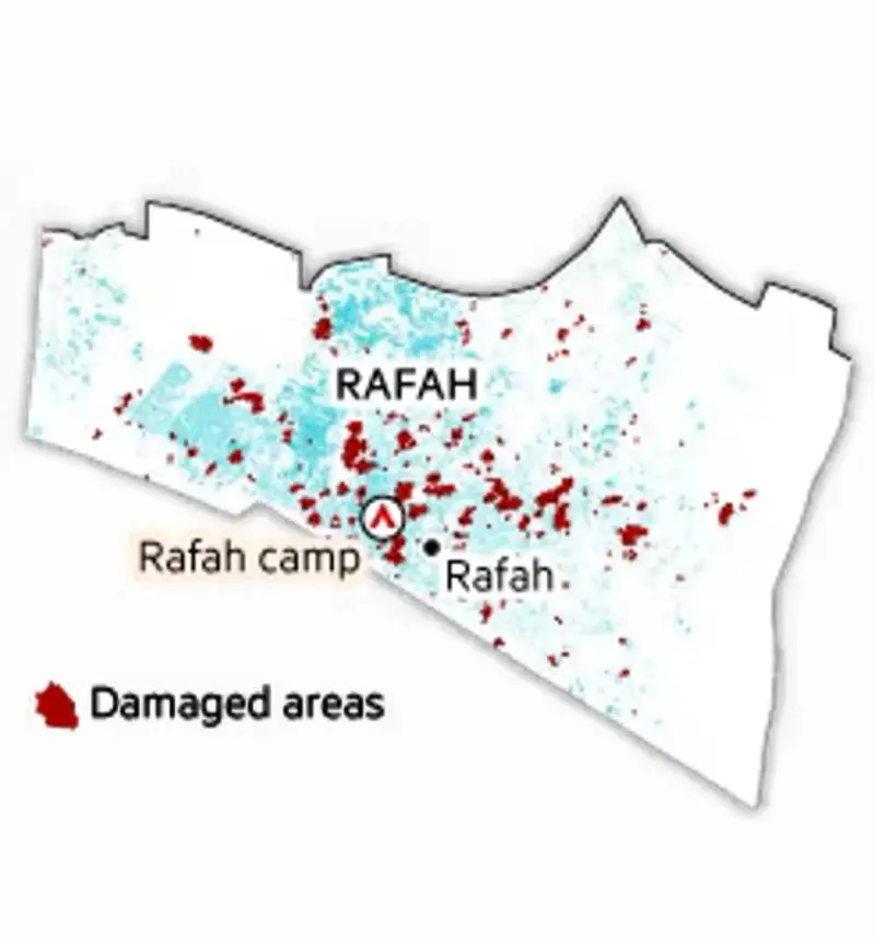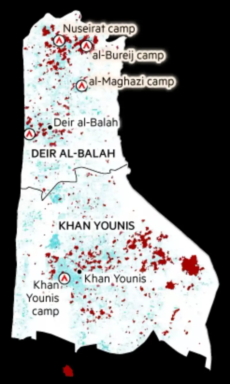 ووفقًا لتحليل بيانات الأقمار الصناعية، ولمقاطع فيديو وصور تتدفّق من القطاع على مواقع التواصل الاجتماعي منها ما يُنشر من قبل مراسلين ميدانيين ومنها من الجيش الإسرائيلي نفسه، يبدو المشهد في قطاع غزة مروعا مع حطام يملأ الشوارع والأسواق والمدارس والمساجد والمستشفيات.