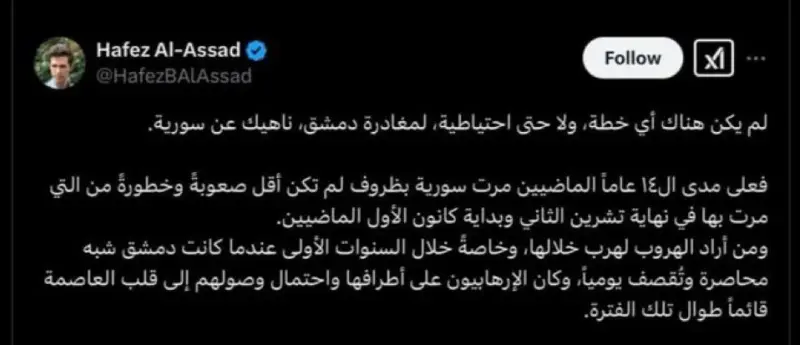 وفي التفاصيل، نشر حساب منسوب لنجل بشار الأسد، حافظ بشار الأسد، منشورًا على منصات التواصل الاجتماعي يكشف فيه عن تفاصيل اللحظات الأخيرة لهروب والده قبل انهيار النظام السوري، وتوجه أسرة الأسد إلى موسكو.