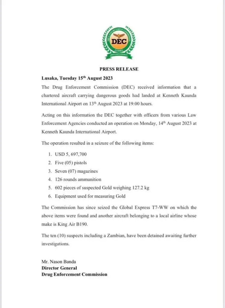وزاد باندا: "ضُبطت الطائرة، وطائرة أخرى تابعة لشركة طيران محلية، كما عُهد بالأموال إلى بنك زامبيا في انتظار نتيجة التحقيق".