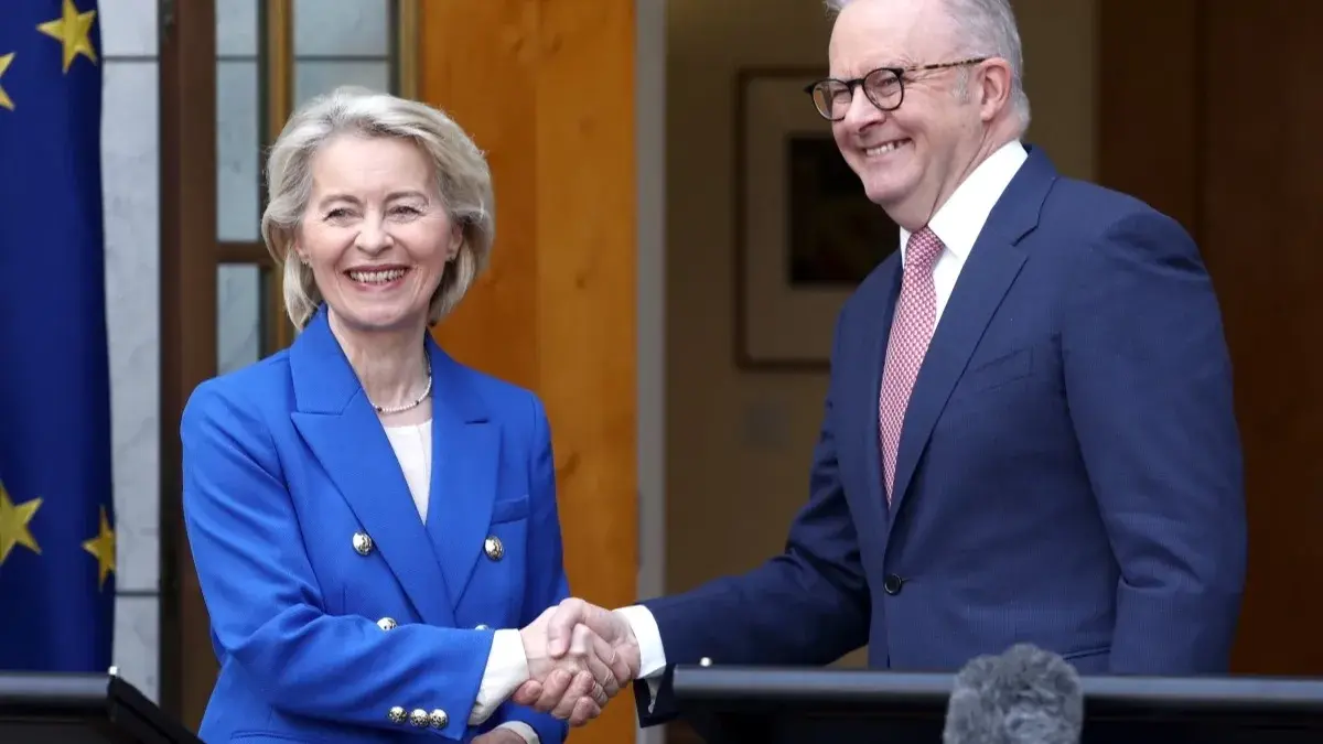توصلت رئيسة المفوضية الأوروبية أورسولا فون دير لايين ورئيس الوزراء الأسترالي أنتوني ألبانيزي إلى اتفاق تجارة حرة في كانبيرا الثلاثاء، وذلك في إطار إجراءات تهدف إلى تعزيز الصادرات في مواجهة حالة عدم اليقين العالمية بشأن التجارة.