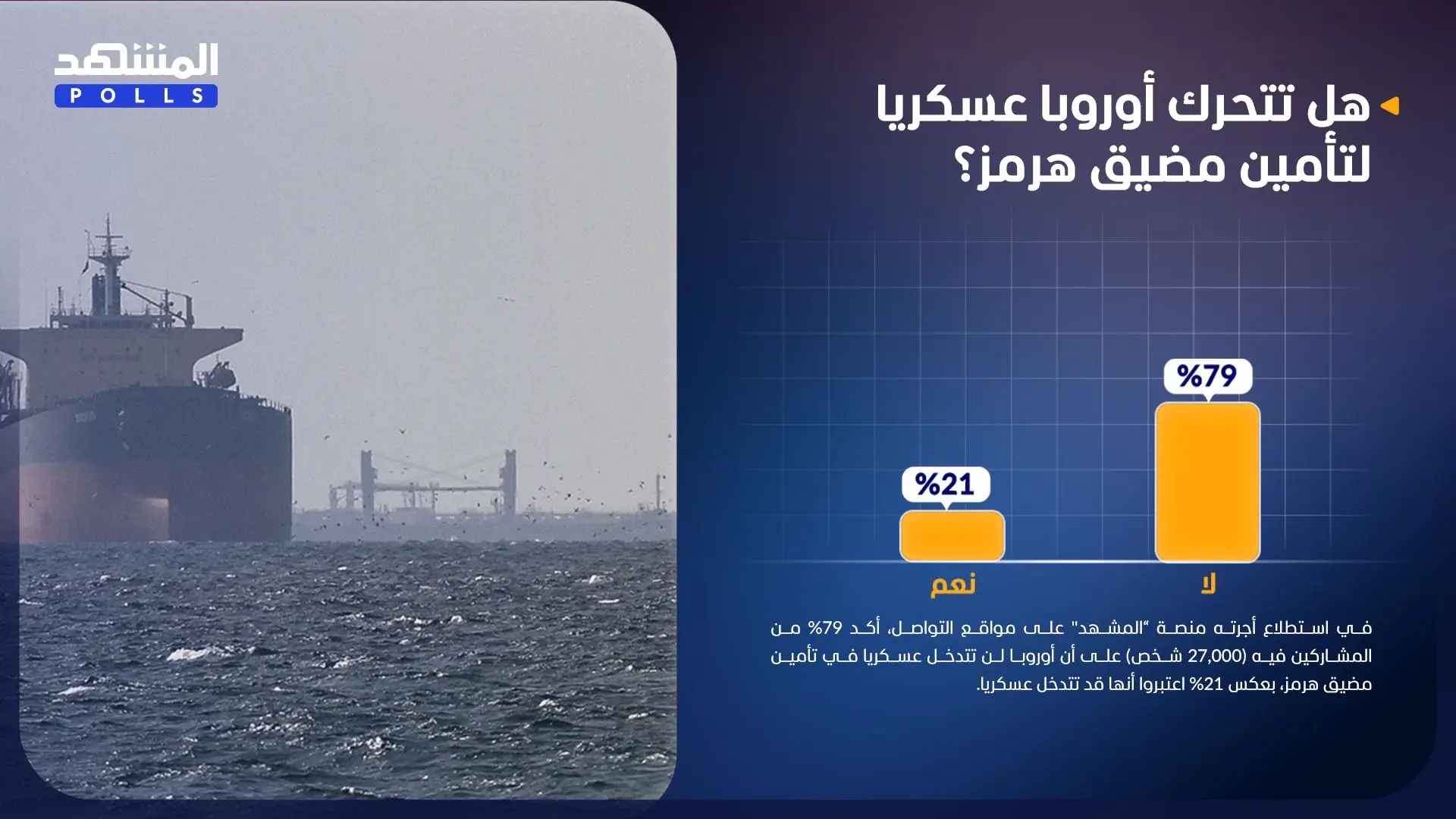 في استطلاع أجرته منصة “المشهد" على مواقع التواصل، أكد 79% من المشاركين فيه (27,000 شخص) على أن أوروبا لن تتدخل عسكريا في تأمين مضيق هرمز، بعكس 21% اعتبروا أنها قد تتدخل عسكريا.