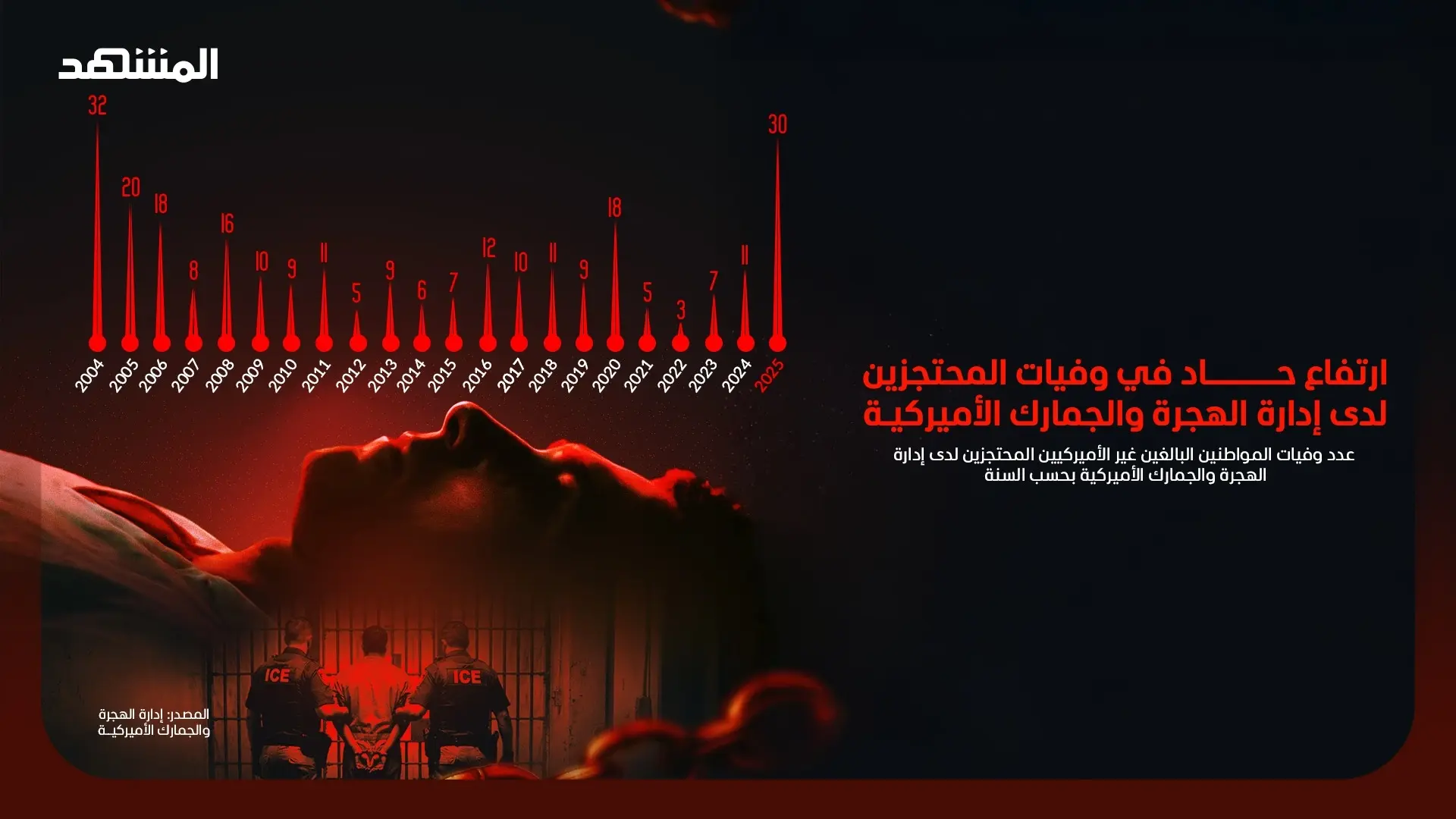 ارتفعت وفيات المحتجزين لدى إدارة الهجرة والجمارك الأميركية ( ICE) إلى أعلى مستوى لها منذ أكثر من 20 عامًا في عام 2025. ووفقًا لبيانات إدارة الهجرة والجمارك، توفي ما لا يقل عن 30 شخصًا من غير المواطنين الأميركيين أثناء احتجازهم خلال ذلك العام.